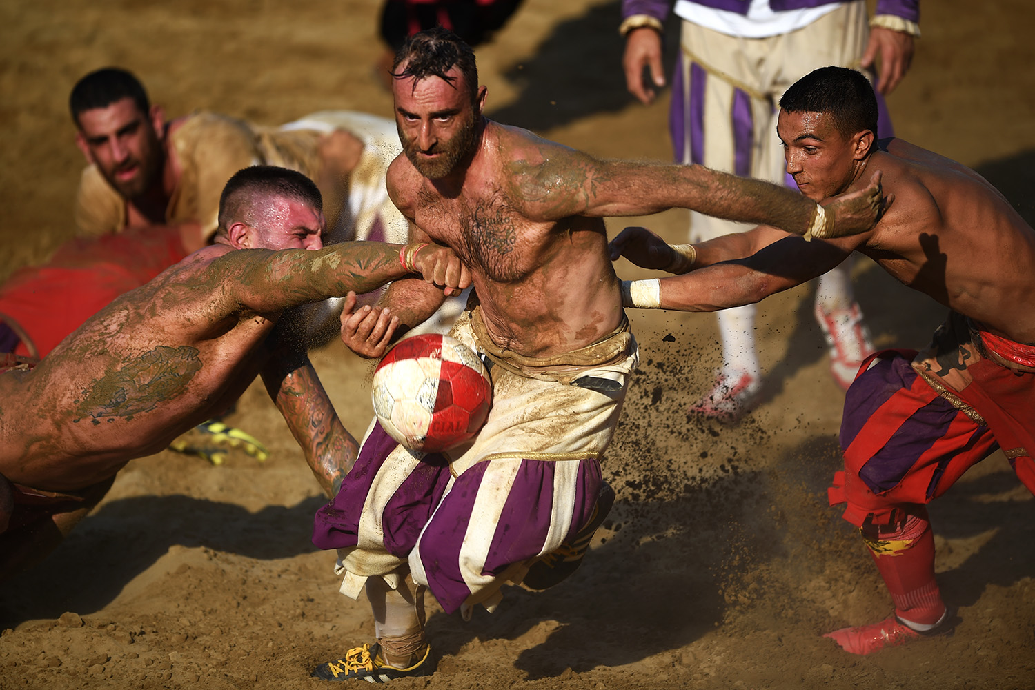 Each year in June, finalists in the violent Renaissance sport of Calcio storico face off in Florence's famous Santa Croce square. The competition, held in honour of Jean-Baptiste, the Tuscan capital's patron saint, sees burly men in historical costumes wrestle for the ball in agame that combines elements of football, boxing and rugby. The elegant piazza becomes a mud bath for the occasion, echoing the original conditions the game was played in, when rich nobles -- no peasants allowed -- played every evening between Christmas and Easter.