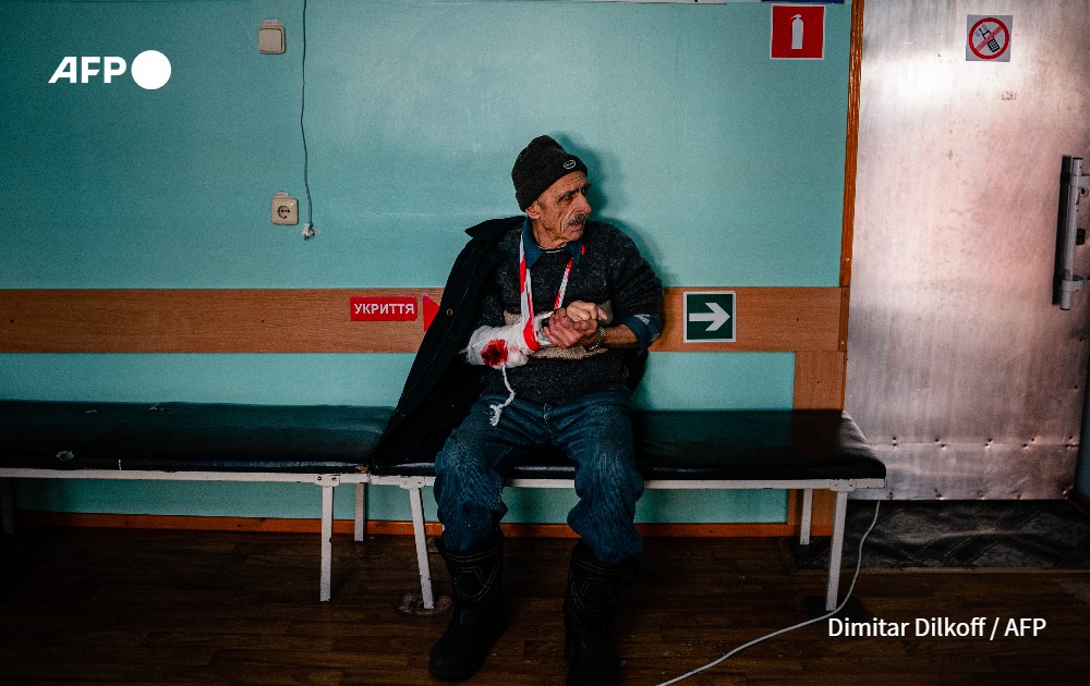 A local resident injured after a shelling sits in a hospital in Kherson on December 21, 2022, amid the Russian invasion of Ukraine.