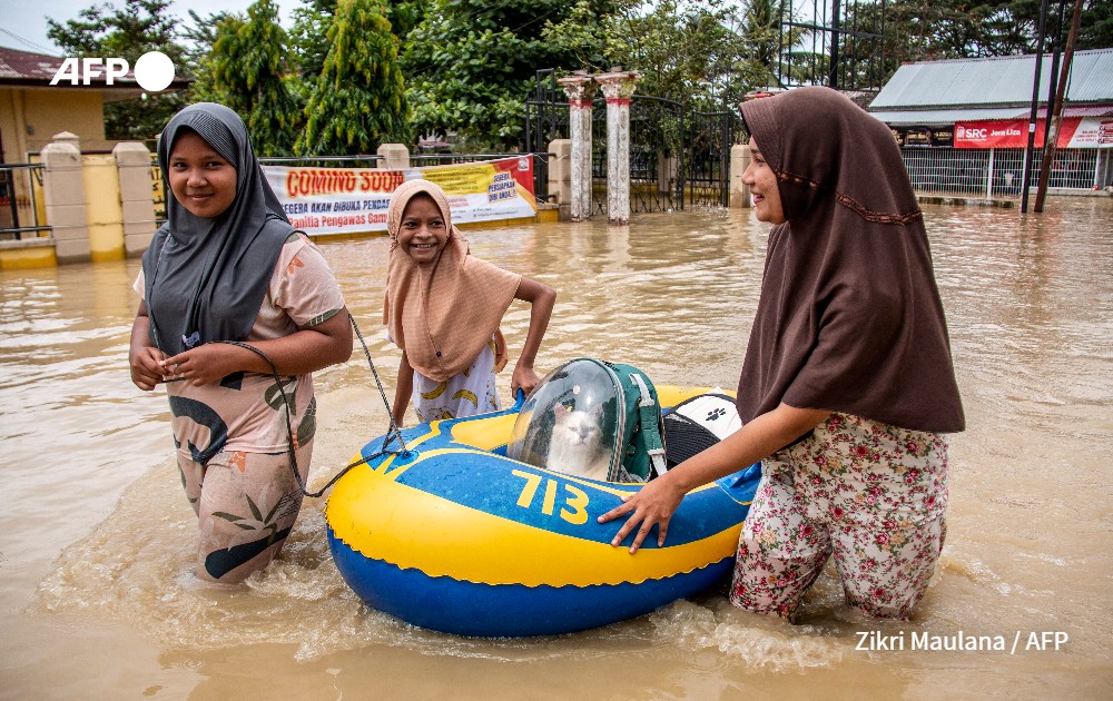 People save a cat in a flooded area in Matangkuli, North Aceh, Indonesia on December 21, 2022.