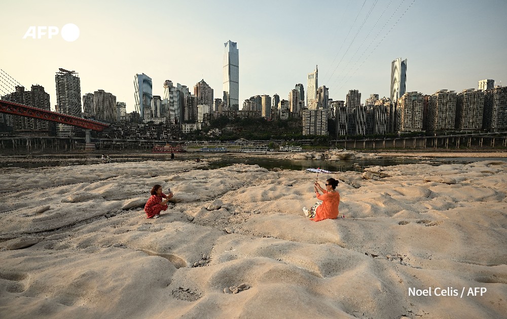 People are seen at the dried-up riverbed of the Jialing river, a tributary of the Yangtze River in China's southwestern city of Chongqing on August 25, 2022.