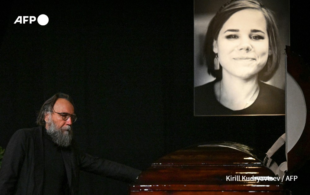 Russian ideologue Alexander Dugin attends a farewell ceremony of his daughter Daria Dugina, who was killed in a car bomb explosion the previous week, at the Ostankino TV centre in Moscow on August 23, 2022. Daria Dugina followed in her father's footsteps, becoming a well-known media personality who worked for pro-Kremlin television channels including Russia Today and Tsargrad.