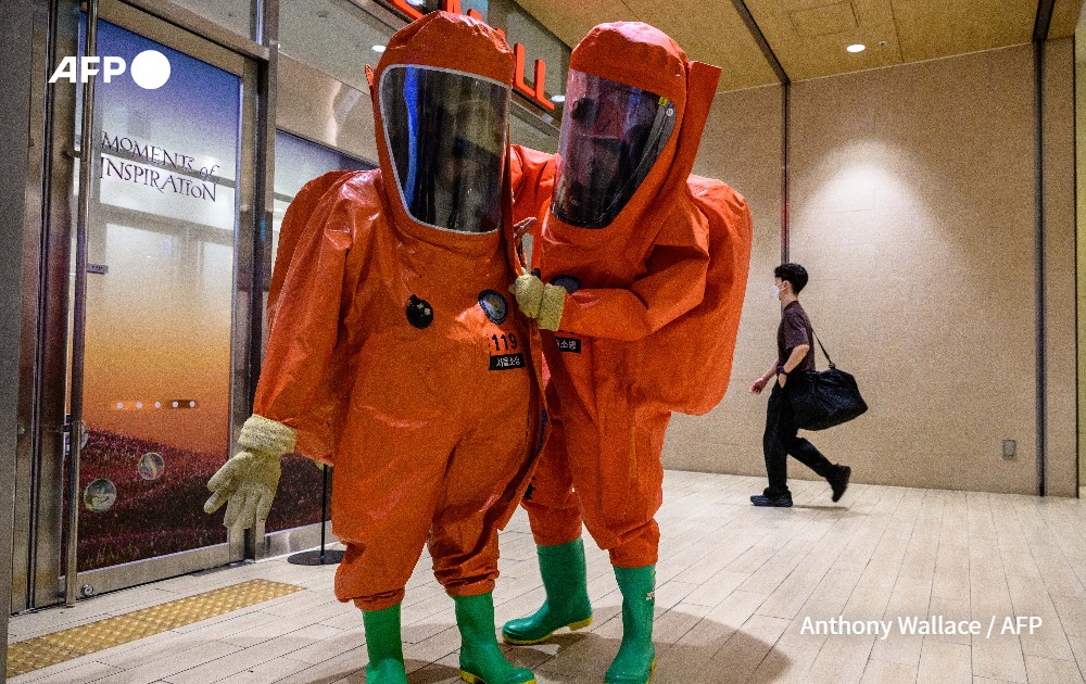 South Korean emergency services personnel wearing protective clothing participate in an anti-terror and anti-chemical terror drill on the sidelines of the joint South Korea-US Ulchi Freedom Shield (UFS) military exercise, at a shopping mall in Seoul on August 23, 2022.
