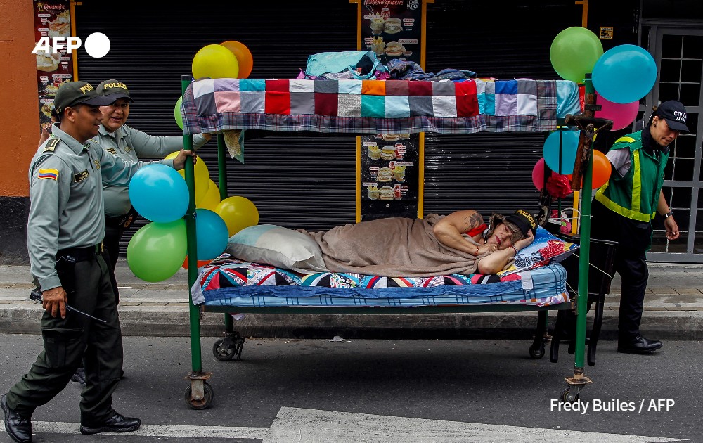 Policemen push a bed as people celebrate the World Day of Laziness in Itagui, Colombia, on August 21, 2022.
