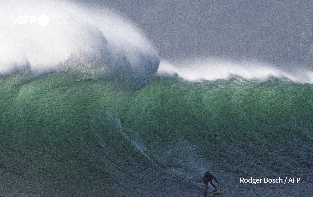 A surfer catches a wave at Sunset, an offshore surfing spot close to Hout Bay, that produces some of South Africa's biggest waves in Cape Town, on August 22, 2022. This spot needs a variety of conditions like wind, swell size, wave period and direction, that often follows storms, to produce huge waves on an offshore reef, which attracts and challenges the surfers.