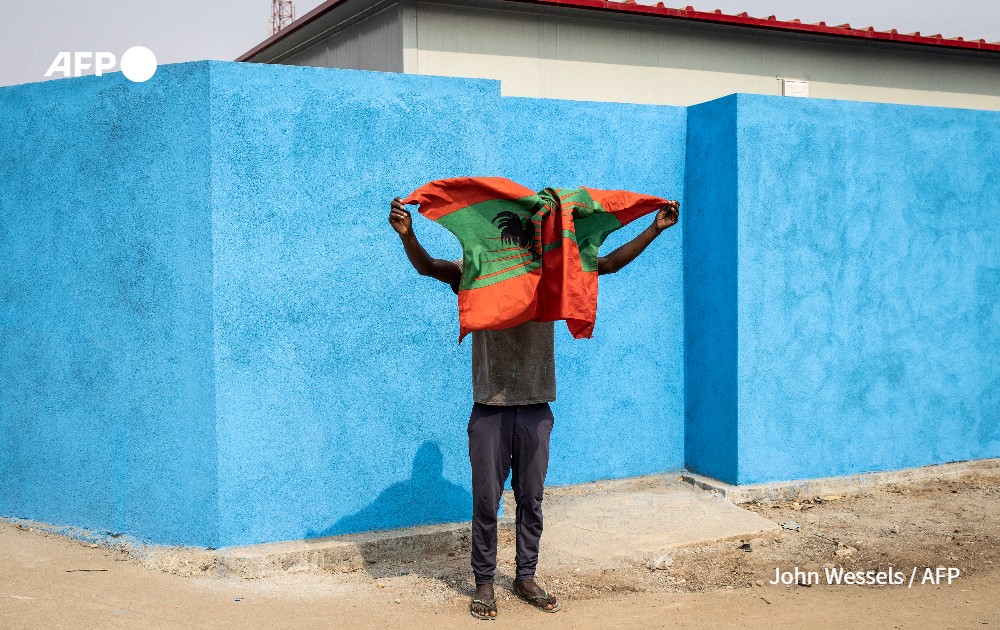 A supporter of Angolan opposition party National Union for the Total Independence of Angola (UNITA) holds a party flag during the UNITA final campaign rally ahead of general elections, in Luanda, on August 22, 2022. Angolans head to the polls on August 24, 2022, to vote in general elections.