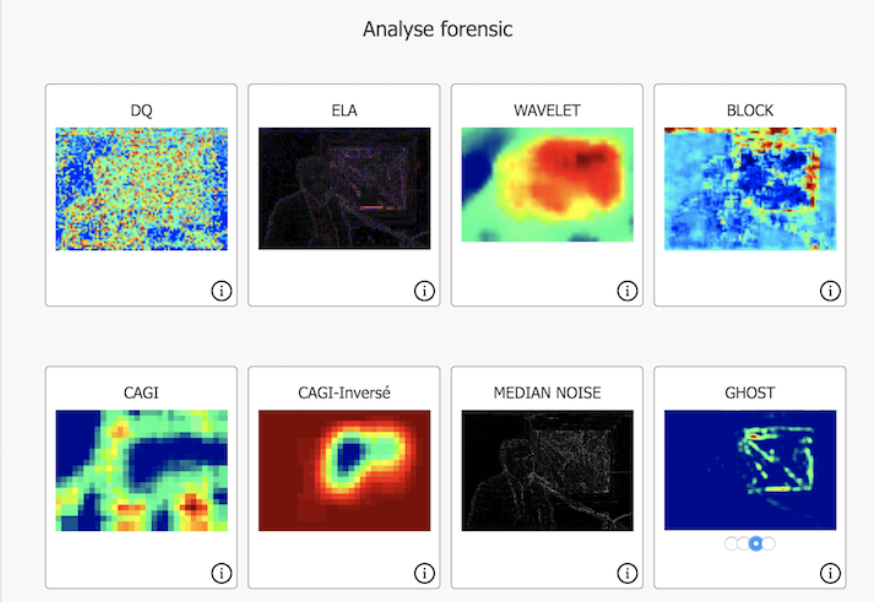 Revenez ensuite à l’image détournée et cliquez sur "la recherche Forensic" sous l’image. En faisant défiler la page vers le bas, vous pourrez voir comment une image peut être analysée avec des outils numériques. Le filtre numéro 3 montre bien que c'est la peinture qui a été détournée.