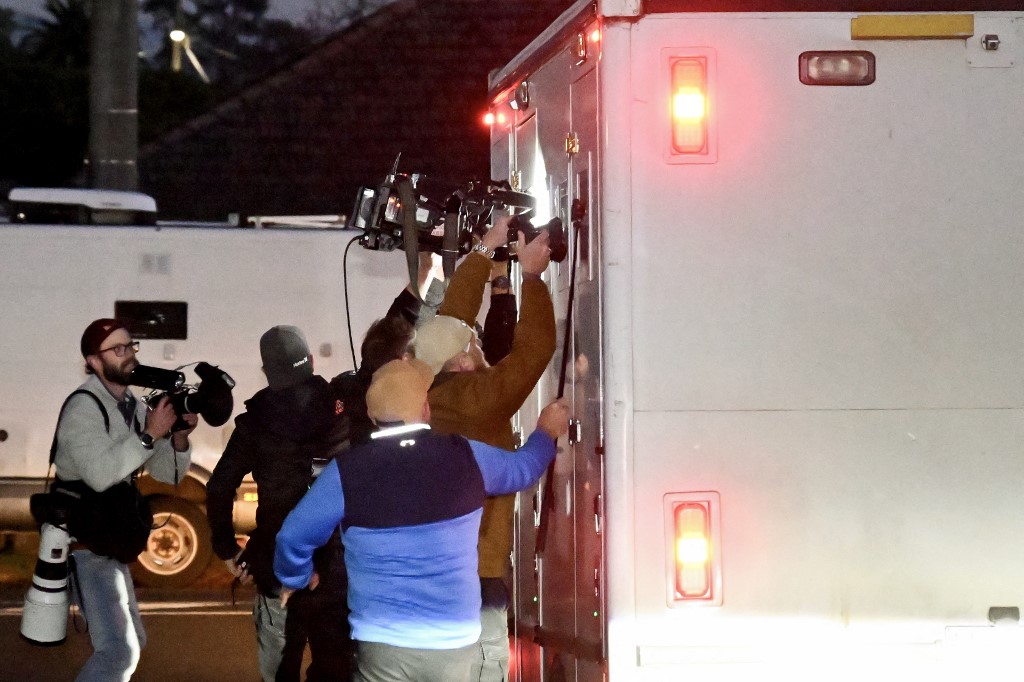 Les médias (photo 7) suivent le véhicule de police transportant Patterson, le 7 juillet 2025. À gauche, Martin Keep avec son dispositif photo improvisé. © William West / AFP