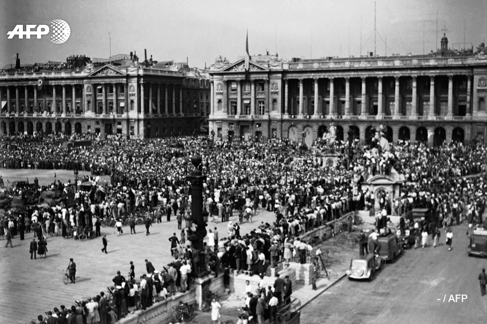 (Des Parisiens rassemblés Place de la Concorde pour assister au Défilé de la Victoire marquant la fin de la bataille de Paris pendant la Seconde Guerre mondiale.)