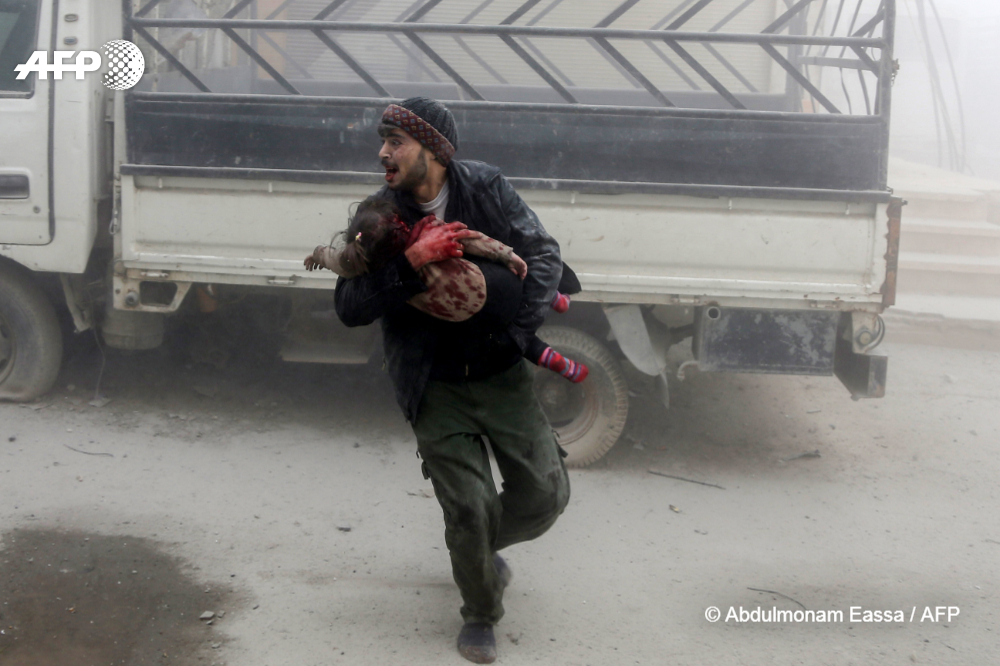 Abdulmonam Eassa prend la  troisième place dans la catégorie “Spot News” pour un cliché montrant un civil évacuant un enfant après des frappes aériennes du régime sur la ville de Saqba, dans la Ghouta orientale, banlieue de Damas.