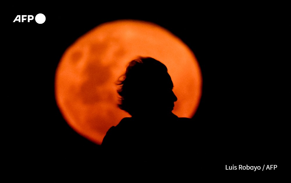 A man's profile is silhouetted against the first full moon of November, known as the Beaver Moon, in Buenos Aires on November 27, 2023.