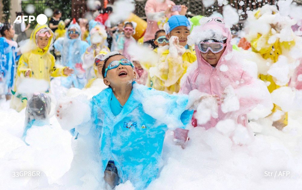 Shows children playing with bubbles at a kindergarten during an event to celebrate International Children's Day in Nanjing, in China's eastern Jiangsu province. STR / AFP