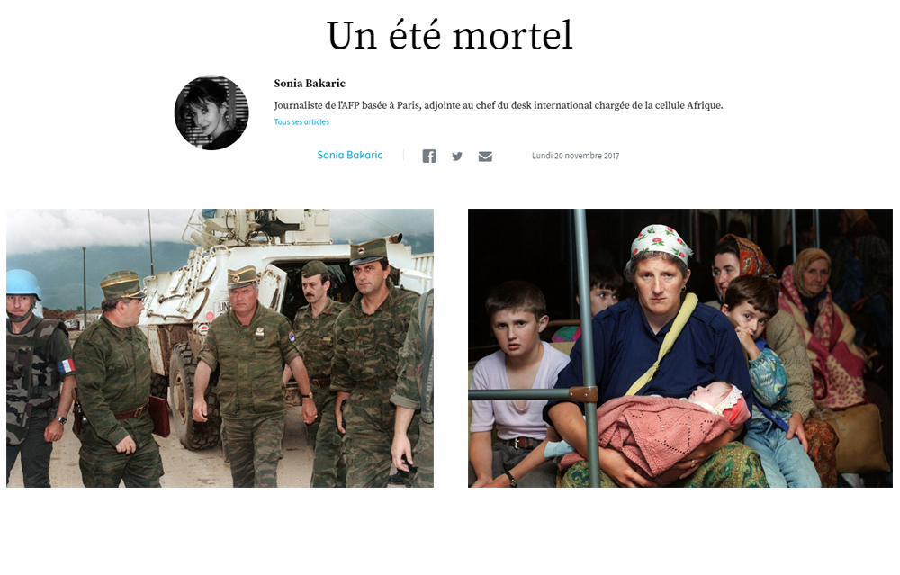 Sonia a raconté dans un billet Making-of, Un été mortel, la Chute de Srebrenica, en 1995. Son billet a été largement partagé sur les réseaux sociaux et repris dans les médias (RTBF, Europe1) suite à la condamnation à la perpétuité par le Tribunal pénal international du général serbe Ratko Mladic, le « Boucher des Balkans ».