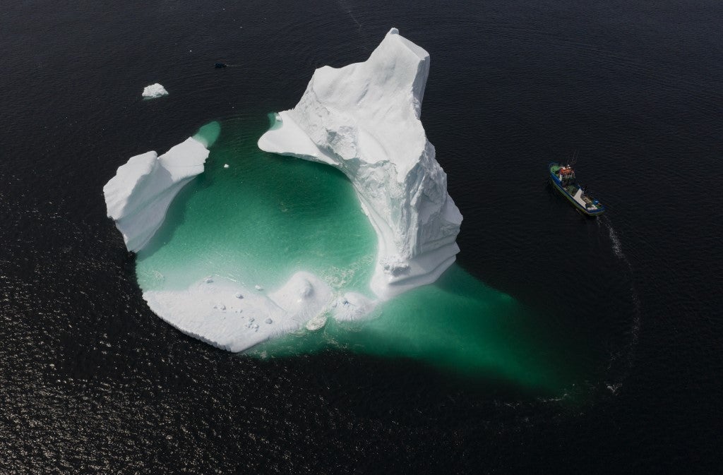 Une photo aérienne montrant le bateau du capitaine Edward Kean passant près d'un iceberg dans la baie de Bonavista, le 29 Juin, 2019 Terre-Neuve, au Canada. Johannes Eisele/AFP