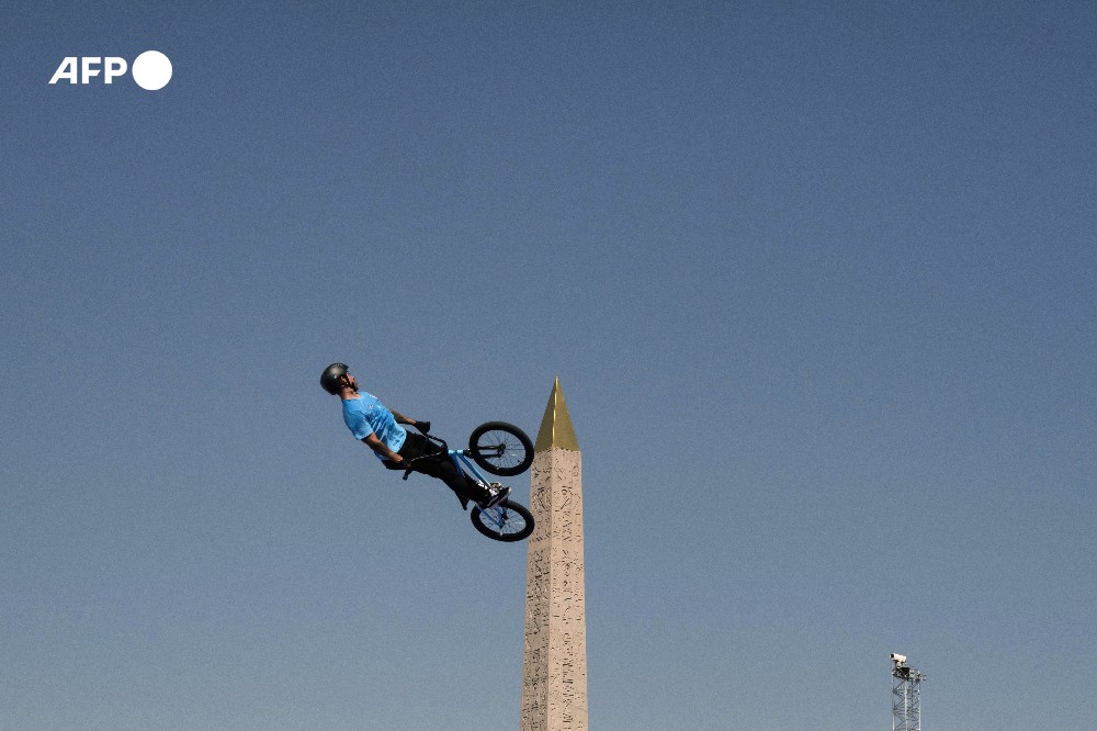 O argentino José 'Malingo' Torres, ouro olímpico no BMX livre, durante treino para os Jogos Olímpicos de Paris 2024 na Place de la Concorde. © Jeff Pachoud / AFP