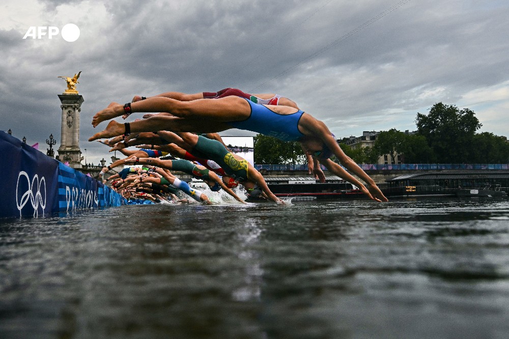 Triatletas saltam nas águas do Sena na largada do triatlo feminino nos Jogos Olímpicos de Paris 2024. © Martin Bureau / POOL / AFP